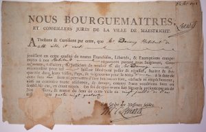 PASSEPORT d'un An délivré par les «Bourguemaitres et Conseillers jurés de la Ville de MAESTRICHT», à M. DENNUY Habitant de cette Ville, le 20 Juillet 1794. Texte en Français. 1p (20 x 33). Imprimé rempli à l'encre.Consolidations au verso.