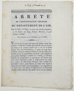 AIN. CHASSE AUX LOUPS. 1797. "Arrêté de l'administration Centrale du Département de l'AIN, sur la Chasse, la Pêche, le service des Gardes-Champêtres, et les Battues aux LOUPS, RENARDS, BLAIREAUX, et autres animaux nuisibles." - du 15 Germinal an...