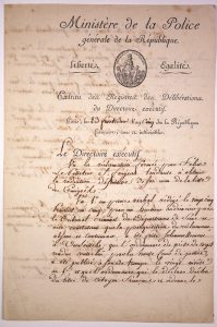 Ministère de la Police sur l'Extrait des registres des Délibérations du Directoire exécutif qui certifie conforme l'Arrêté permettant la Radiation du Nom de Félix LE PELLETIER SAINT FARGEAU propriétaire à Versailles de la Liste des Émigrés ainsi que la levée des séquestres sur tous ses biens - PARIS 23 fructidor an 5 (9 Sept. 1797) - 3pp in folio avec cachet et vignette .[LE PELLETIER SAINT FARGEAU Félix (1769-1837) Publiciste et homme Politique français, frère du Conventionnel assassiné à PARIS en 1793. Il était Aide-de-camp du Prince de LAMBESC avant de donner sa démission le 3 juillet 1789. Fervent défenseur de la démocratie qu'il défendit du 9 Thermidor au 18 Brumaire; il fut impliqué dans l'affaire BABEUF et compris dans la liste de ceux qui devaient être déportés aux îlesSECHELLES, avant d'être acquitté] .