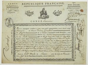 SAINT-MALO (35). ARMÉE D'ANGLETERRE, 89° Demi-Brigade - Pièce signée du Général ROMAND Commandant la Subdivision des CÔTES DU NORD - CONGÉ provisoire délivré au Citoyen Urbain GUICHARD ditFusilier, natif de PARCAY Canton de SABLAIS (Sarthe)...