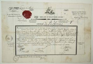 1800). Congé de réforme pour blessure au citoyen Joseph VIOLLET, natif de Champlitte (Haute-Saône), brave militaire et bon soldat qui a fait toutes les campagnes de cette guerre. 1page (31,5 x 46), remplie à l'encre. Vignette «Patria». Sceau de cire rouge du Régiment.