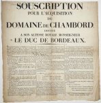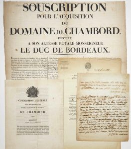 (HENRI V) LE COMTE DE CHAMBORD et LE CHÂTEAU DE CHAMBORD (1820/1821) 4 Lettres et pièces:Affiche (42,5 x 42). «SOUSCRIPTION pour l'acquisition du DOMAINE DE CHAMBORD (41) destiné à Son Altesse Royale Monseigneur LE DUC DE BORDEAUX.» Impr. à...