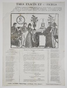 les circonstances, l'ingénieuse cachette de nouvelle invention, et la réponse faite par la duchesse de Berri. Complainte à ce sujet.» Image (44 x 33) à Paris, chez GARSON, Fabricant d'images, 25 rue la Huchette; Impr. de Chassaignon, 7 rue Gît-le-Coeur.Déchirure d'un angle avec perte de mots. Image épargnée.