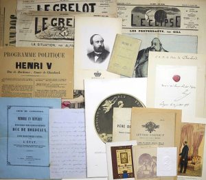 «Donné à M. François FRANCHET D'ESPEREY, HENRY. Cologne 21 Juillet 1858» + 1846 Lettre-circulaire Lithographiée du Comte de CHAMBORD (Henry V) de Frohsdorf, le 28 Oct. 1846. + «FRANÇAIS. VIVE LE ROI» Retour des Bourbons, HENRI V, CHAMBORD 5 Juillet 1871. P.E. DELHAYE. Impr.16pp in-8°+ Lettre circulaire impr. de l'Exécuteur testamentaire du Comte de Chambord, Paris 1884 + Lettre du Père DUCHÊNE à Mr le Comte de CHAMBORD; Impr. 8pp in-12° + Lettres d'HENRI V depuis 1841 jusqu'à présent.» Impr. 8pp in-8° + Trombinoscope du Comte de CHAMBORD, impr. in-8° + Mémoire en réplique pour le Duc de BORDEAUX et Louise-Marie-Thérèse d'ARTOIS contre l'État. Impr Paris chez A. Sirou, 1846; 20pp in-4° + «HENRI V, sa vie intime» Impr. 64pp in-16° + «Programme politique de HENRI V Duc de Bordeaux, Comte de Chambord.» (supplément du Châtiment du 17 août 1873) 2pp in-folio + 7 Cartes royalistes, in-12°, certaines en faveur d'HENRY V. + 12 Revues satyriques illustrées (1872/1873) LE GRELOT, L'ÉCLIPSE, concernant le Comte de CHAMBORD + «Journal de Toulouse» du 25 Août 1883, annonçant la mort du Comte de CHAMBORD, à Frohsdorf, le 24 août, à 7 h du matin. Portrait impr. in-8° et divers.L'ensemble: