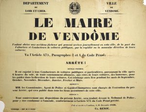LOIR ET CHER. ÉCLAIRAGE DES VOITURES. Placard (42,5 x 55) - Arrêté d'Ulysse RENOU Le Maire de VENDÔME, fait le 6 Décembre 1836, voulant obvier aux accidents fâcheux qui peuvent arriver journellement en cette ville, de la part des voituriers et...