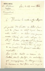 autographe signée Baron PETIT, Commandant l'Hôtel Royal des INVALIDES (En-tête imp.) - Paris 13 Mai 1844 - 2pp in-8° - "Monsieur le Comte et Cher Collègue. Je joints à la présente un billet pour voir les plans en relief disposés dans notre hôtel. Ces billets sont chaque année délivrés par notre Collègue le Lieutenant-GénéralDODE, Inspecteur Général du Génie... Pour visiter l'Hôtel on trouve à l'entrée, sous le péristyle, des conducteurs qui accompagnent les étrangers, s'ils le désirent, et leur font voir ce qu'il y a de remarquable..."