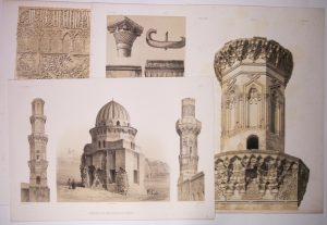 «Détails, Mosquée d'Inn-Toûloûn.» «Minaret, Mosquée Mohammed el Naçer, au Kaire.»..). 4 Planches décoratives (à vue 37 x 53)