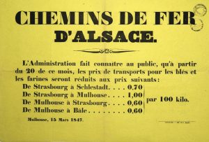 «CHEMIN DE FER D'ALSACE.» MULHOUSE (Haut-Rhin), 15 Mars 1847. (Ligne Mulhouse-Thann crée en 1839) Affiche timbrée (31 x 45).Avis «... le prix du transport pour les blés et les farines seront réduits aux prix suivants; Tarif des prix pour...