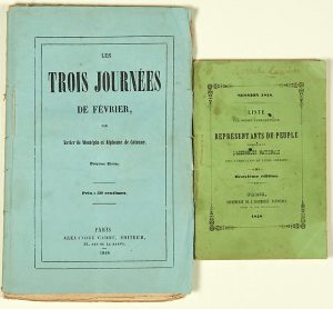 2 IMPRIMÉS DE 1848: «LES TROIS JOURNÉES DE FÉVRIER» (Les trois Glorieuses) par Xavier de Montépin et Alphonse Calonne; 2ème Edition. Impr. Paris, Alexandre CADOT Éditeur, 1848.+ «LISTE par ordre alphabétique des REPRÉSENTANTS DU PEUPLE...