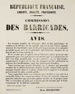 capitale, ont cru devoir élever spontanément des barricades sans avoir pris la précaution de s'entendre préalablement avec la Commission spécialement chargée de ce travail par le Gouvernement... de la défense Nationale.» - Imprimerie Nationale. Sept. 1870 - Affiche (56 x 45,5) Etat A.