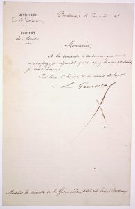 Cahors 1838 - 1882 - Membre du Gouvernement de la Défense Nationale Sept 1870/Fév. 1871 - Ministre de l'Intérieur et de la Guerre - L.S. "L. GAMBETTA" Ministre de l'Intérieur - BORDEAUX (33) 4 Janvier 1871 - à Mr le Vicomte de la Gueronnière,...