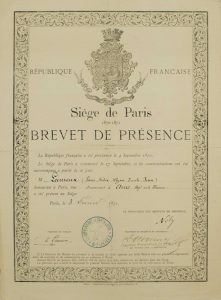 commandant de la 3ème Cie Bis des Canonniers auxiliaires. (Cachet) - 1p imprimé rempli à l'encre aux armes de Paris. (36 x 26) de l'Imprimerie Alcan Lévy, 11 rue Lafayette. «AucunBrevet ne pourra être délivré, s'il ne porte une date antérieure au dernier jour du Siège. La planche qui a servi à imprimer le présent Brevet sera détruite le jour de la délivrance de Paris.»