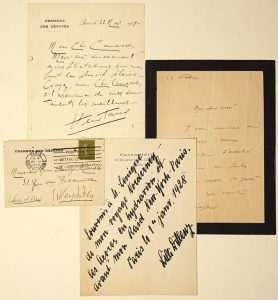 1924, Résistant - Lettre Autographe Signée HEURTAUX à l'en-tête "Chambre des Députés" - Paris 22 Nov. 1919; 1p in-8° + l'Enveloppe - "Mon Cher Camarade, Merci très sincèrement de vos félicitations qui me font le plus grand plaisir..." Il vient d'être élu Député de SEINE-ET-OISE à 26 ans le 19 nov. 1919.+ Le Commandant MIZEIGUE - AS aux 134 bombardements - 6 avions abattus - prisonnier évadé - Il fut égalementAS au Maroc où il fut tué d'une balle dans le ventre en 1925 - Lettre Autographe Signée (à Georges MADON) 22Octobre - bordée de noir - 3pp in-8° - "Mon cher Ami, je vous remercie de tout coeur du témoignage d'amitié dont vous me faites part au sujet du grand malheur qui vient de me frapper... Mes chefs l'ayant compris, j'ai quitté momentanément le commandement de mon escadrille et je suis au repos à l'État-major de la 1ère Brigade de bombardement... Je reprendrais un travail actif pour faire payer aux boches le dernier coup qui vient de me frapper..." + Lilly DILLENZ Célèbre Aviatrice; Billet souvenir autographe signé sur papier à lettre du "Grand Hôtel" à Paris - "Souvenir à Mr LENIQUE de mon voyage Norderney - Les Açores en Hydravion et avant mon Raid New-York-Paris.- Paris le 1er Janvier 1928, Lilly DILLENZ." - 1p in-8°.Les trois:
