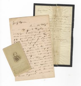Manoscritti a inchiostro marrone scuro. 1 lettera su carta listata a lutto. In totale scritte 3 pagine.