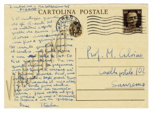 CALVINO Italo, Cartolina postale viaggiata autografa firmata inviata al padre Mario. Datata 1 febbraio 1943.