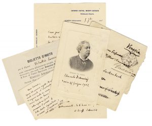 Id. : 1 biglietto da visita con lunga annotazione autografa, 1 cartolina viaggiata con firma autografa di De Amicis, 1 biglietto di invito ad una conferenza dello scrittore e 1 busta con indirizzo autografo.