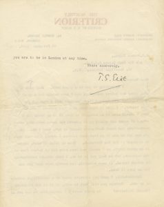 1 carta scritta recto e verso. Dattiloscritto e firma a inchiostro nero su carta intestata "The Monthly / Criterion".