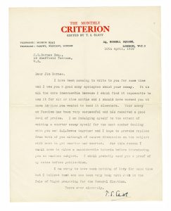 ELIOT THOMAS STEARNS, Lettera dattiloscritta con firma autografa inviata al teorico del fascismo James Strachey Barnes. Datata 10 aprile 1929