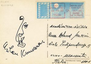 KUNDERA Milan, Firma autografa e disegno dello scrittore su cartolina viaggiata. Datata 1985