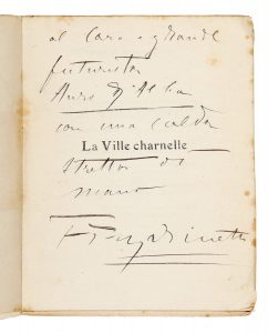 MARINETTI Filippo Tommaso, Dedica autografa su libro La ville charnelle. Paris, Sansot 1908.