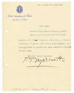 MARINETTI Filippo Tommaso, Lettera dattiloscritta con firma autografa inviata ad una amica. Datata 6 novembre 1940.