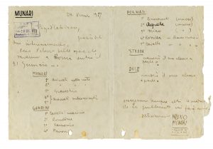 «[...] Ecco l'elenco delle opere che saranno a Roma [...] : Munari : 1) animali nella notte [...] 3) Granchio - 4 e 5) Animai subcoscienti. Gambini [...] Dormal [...] Strada [...] Duse [...]».