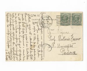 RATTI Attilio (Papa Pius XI), Cartolina postale viaggiata, autografa firmata, inviata al Prof. Antonio Favaro. Datata 21 novembre 1913, Roma.