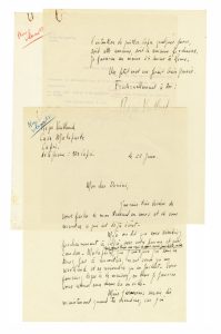 Manoscritto e dattiloscritto a inchiostro nero. 3 carte scritte in totale. Con intestazione a mano "Casa Malaparte / Capri". Testi in francese. Dimensioni varie. (2)