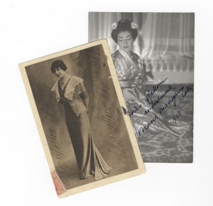 CALLAS Maria, Ritratto fotografico in bianco e nero con abito di scena di Madama Butterfly con dedica e firma (di mano del marito). Non datato.