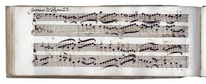 Manoscritto musicale a inchiostro marrone scuro su carta pentagrammata a mano. Spartito per tastiera.