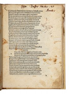 Prima edizione dell'Opera di Avieno, edita per le cure di Vittore Pisano e Giorgio Valla suo maestro, in cui sono raccolti la versione metrica in latino di Avieno del poema astronomico Phaenomena di Aratus Soliensis e due suoi poemi geografici, la versione latina dell'Orbis terrae descriptio di Dionysius Periegetes (carte d3v-f6r) e le Orae maritimae (carte f6r-g8r), un periplo in cui descrive le coste mediterranee da Cadice a Marsiglia basato in larga parte sul Massaliote Periplus, manuale in greco per i mercanti marittimi del VI secolo a.C. andato perduto ; seguono la traduzione latina e il commento dei Phaenomena di Giulio Cesare Germanico (carte h1r-m8r) e di Cicerone (carte m8v-n6v), oltre al Medicinae liber di Quinto Sereno Sammonico qui in prima edizione (carte n7r-p6r), in cui si registra la prima occorrenza del termine abracadabra.