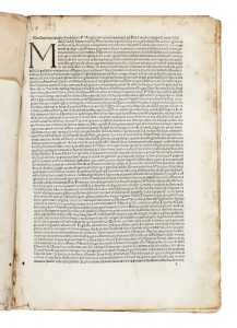 Spazi per capilettera con letterine-guida. Primo quaderno conservato slegato, quaderno P con margini più corti e proveniente da altro esemplare, piccole lacune marginali anche riparate nella prima carta bianca e in pochi altri fogli, fioriture. Legatura cinquecentesca in piena pelle su assi di legno con ricche decorazioni a secco ai piatti, cerniere molto rovinate e piatti quasi del tutto staccati ; dorso con abrasioni e lacune. Note di possesso e glosse in bella grafia tardo-cinquecentesca.