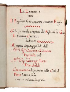 LA ZANNATA o vero Il Bagolino fatto apparire sostituto regio. Scherzo morale composto dai Figliuoli di Gio : Lodovico Casotti, e dedicato al [...] Ill.ma Sig.a Caterina Giovanna figliuola dell'Ill.mo Sig : Giuseppe Maria Frescobaldi... Datato Prato...