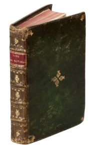 Legatura coeva in pieno marocchino verde con piccoli ferri floreali impressi in oro agli angoli dei piatti e al centro disposti in cerchio, ripetuti ai comparti del dorso a 5 nervi, titoli dorati su tassello al dorso ; tagli rossi.