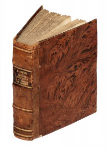 Legatura ottocentesca in mezza pelle con piatti in carta marmorizzata e titoli e fregi in oro su tassello al dorso.