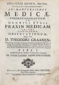 BROEN Johann, Animadversiones medicae, theoretico-praticae in Henrici Regii praxin medicam, quibus editio prior, observationum [...] Theodori Craanen [...] Pars I (-II). Neapoli : ex typographia Felicis Mosca, 1721.