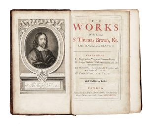 BROWNE Thomas, The works [...] containing I. Enquiries into Vulgar and Common Errors. II. Religio Medici [...]. III. Hydriotaphia ; or, Urn-Burial... London : for Basset, Chiswell, Sawbridge, Charles Mearn, and Charles Brome, 1686.