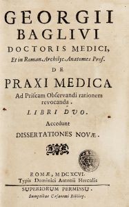 Baglivi Giorgio, De praxi medica ad priscam observandi rationem revocanda, libri duo. Romae : typis Dominici Antonii Herculis, sumptibus Caesaretti bibliop., 1696. 2 parti in 1 volume in-8° (mm 160x105).