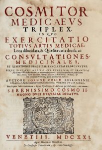COLLE Giovanni, Cosmitor medicaeus triplex, in quo exercitatio totius artis medicae, loca dilucidata, & quaesita varia decisa... Venetiis : apud Baretium Baretium, 1621 (Al colophon:) 1620.