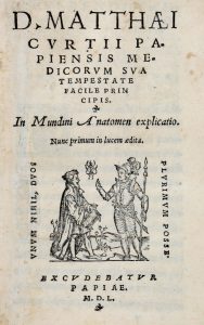 CORTI Matteo, In Mundini Anatomen explicatio. (Al colophon:) Papiae : apud Franciscum Moschenum Bergomensem, et Ioannem Baptistam Nigrum, 1550.