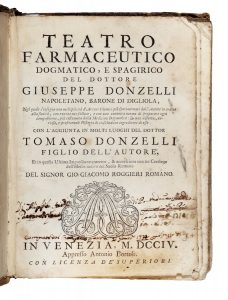 DONZELLI Giuseppe, Teatro farmaceutico dogmatico, e spagirico [...]. Con l'aggiunta in molti luoghi del dottor Tomaso Donzelli figlio dell'Autore... In Venezia : appresso Antonio Bortoli, 1704.