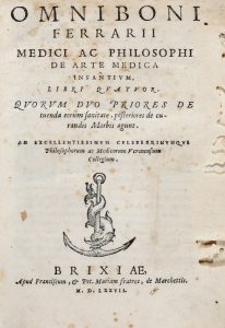 FERRARI Ognibene, De arte medica infantium, libri quatuor. Brixiae : apud Franciscum, & Pet. Mariam fratres, de Marchettis, 1577.