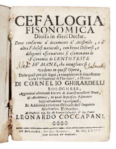 GHIRARDELLI Cornelio, Cefalogia fisonomica divisa in dieci deche, dove [...] si esaminano le fisonomie di cento teste humane che intagliate si vedono in quest'opera... In Bologna : per Gio : Recaldini, 1674.