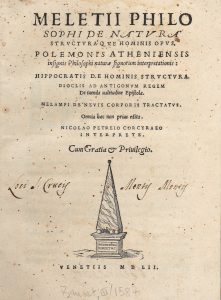 MELETIUS, De natura structuraque hominis opus, Polemonis [...] Naturae signorum interpretationis : Hippocratis De hominis structura... Venetiis : [Camocio], 1552 (Al colophon:) Venetiis : ex officina Gryphii, sumptibus vero Francisci Camotii &...