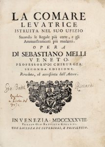 MELLI Sebastiano, La Comare levatrice istruita nel suo ufizio. Secondo le Regole più certe, e gli Ammaestramenti più moderni... In Venezia : Presso Gio. Battista Recurti, 1738.