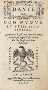 Alighieri DANTE, Dante con nuove, et utili ispositioni. Aggiuntavi di più una tavola di tutti i vocaboli… In Lione : appresso Guglielmo Rouillio, 1575.