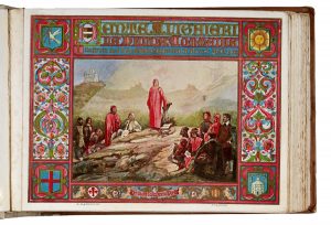 «Testo litografico in caratteri gotici del quattrocento, con numerose figure e iniziali color d'oro e 4 illustrazioni a piena pagina».