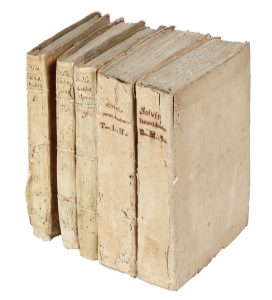 Lavori di tarlo diffusi ai dorsi dei quattro volumi, talvolta con parziale distacco del dorso stesso.