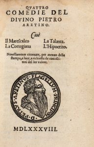 ARETINO Pietro, Quattro Comedie [...] cioè il Marescalco, la Cortegiana, la Talanta, l'Hipocrito... S.l. [ma London] : s.e. [ma John Wolf], 1588.