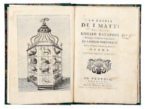 BASAPOPI Gnesio [pseud. di Bona Giulio Cesare], La gabbia de i matti [...] riformata, ed illustrata di annotazioni da Lamillo Fortunato. In Venezia : appresso Tommaso Bettinelli, 1766.